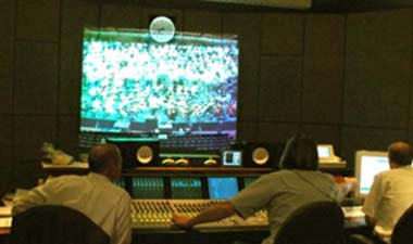 Our recording engineers, Bruce Leek and Fred Vogler, are veterans with years of industry experience. They fly out from California for each project. By the time we arrived, they had set up microphones, preamps, cabling, console, converter, storage devices, monitors, and AC power conditioning ? all of which were needed for modern digital recording. But beyond that, the equipment must be fine-tuned, which meant that before we could record, at least an hour was devoted to listening to the entire group as well as various sections of singers and instrumentalists to make sure the microphones were placed just right.