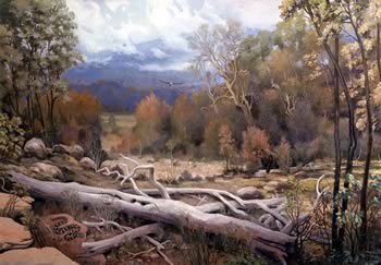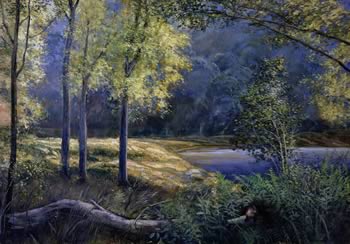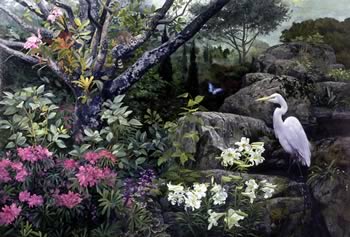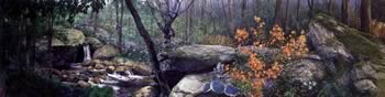 How do you get 6 well known artists with very different styles to blend into one mural? “Since the Hudson River school of painting was at its height about mid 1800, and it was known for its misty interpretations of landscapes, we all decided to emulate that school in our own styles,” said Robert Marshall, “and I think it worked out well.” As it turned out, each room had a door way or a window that roughly divided it in half, so the 2 artists each took a side. “We also critiqued each other’s work, in a constructive and friendly way, said Marshall. “‘That’s an ugly duck’ would bring a laugh and a constructive suggestion. We’re all seasoned enough with immense respect for each other’s work to allow such comments.”