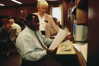 A patron works in one of the more than 3,500 family history centers operated by The Church of Jesus Christ of Latter-day Saints.