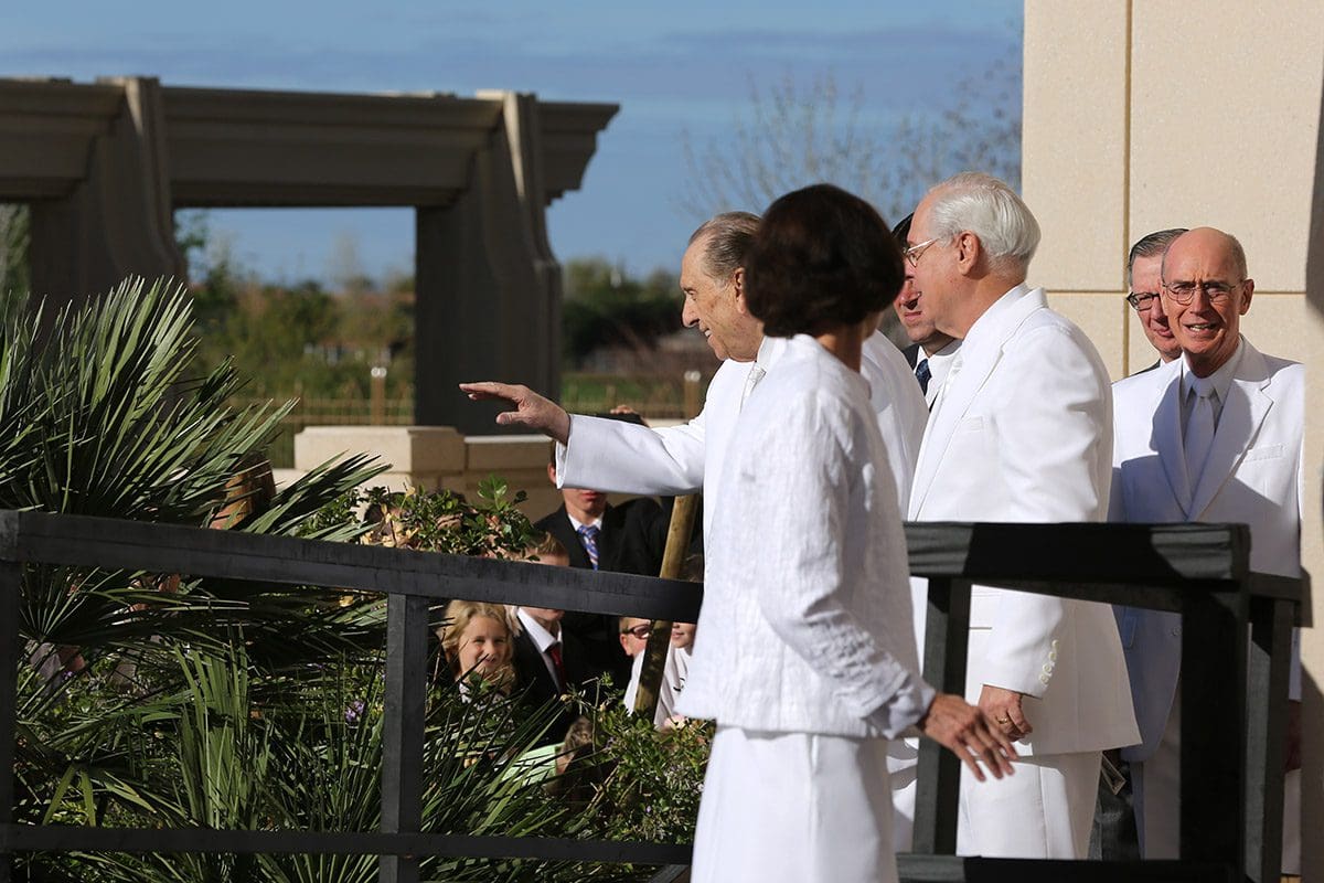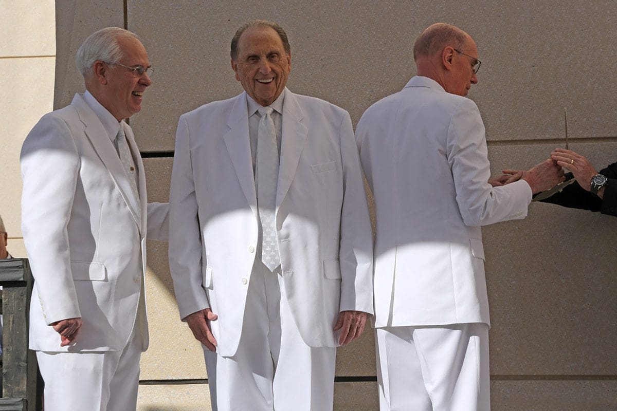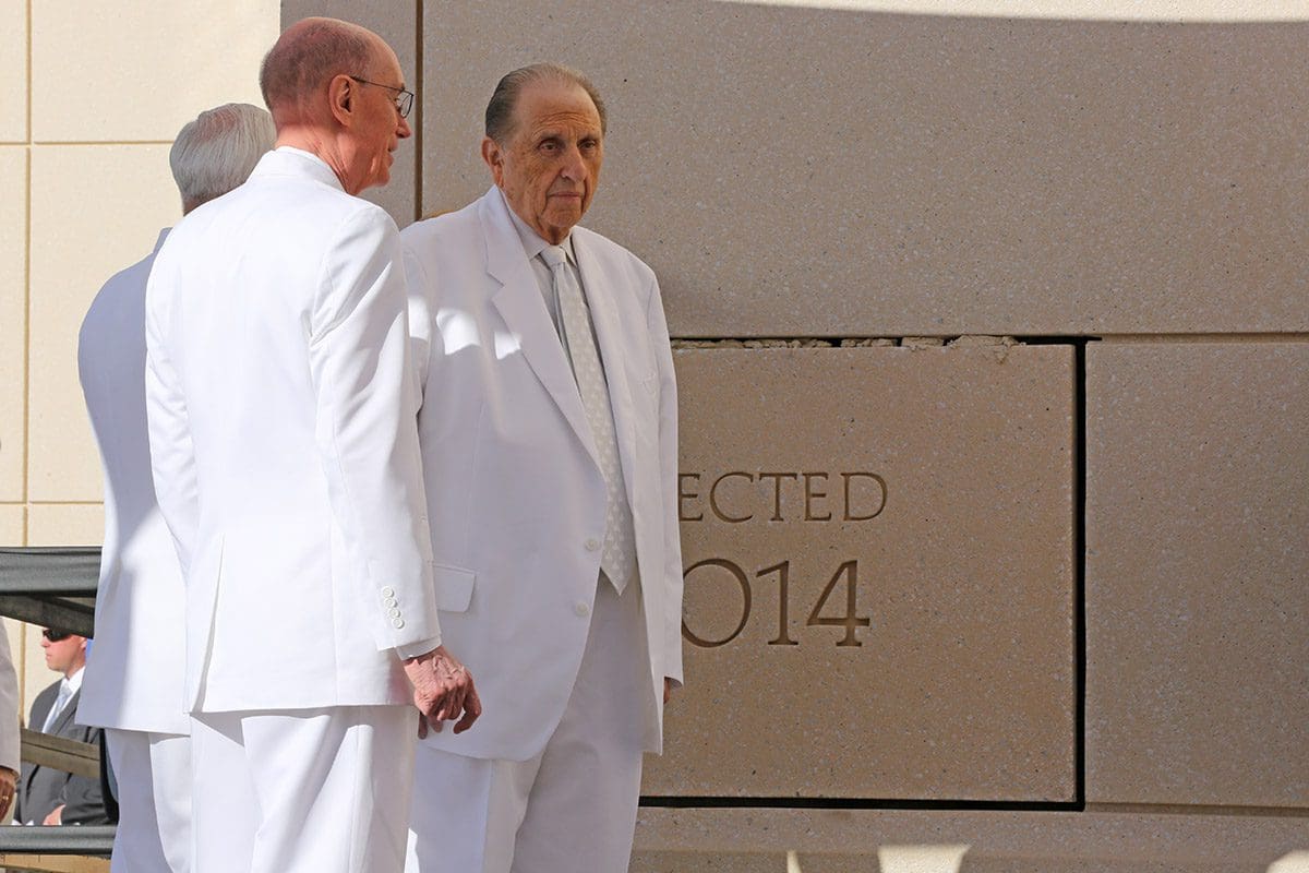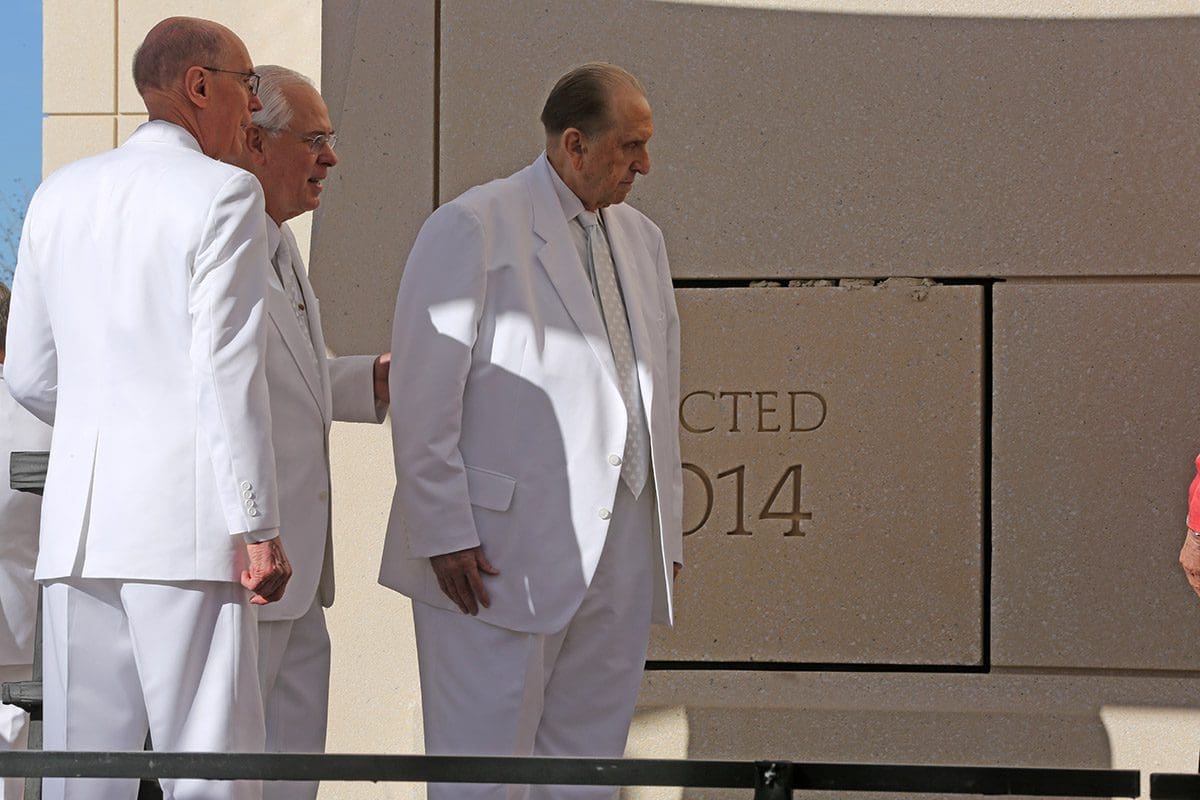 President Monson was the first to put mortar on the stone, then President Eyring. Elder Walker then suggested a priesthood leader to be next with his wife.