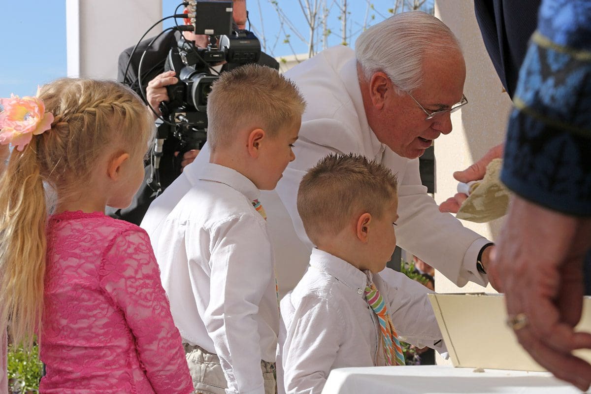 Elder Walker helped each child put a little mortar on the coverstone. Always encouraging to others, President Monson commented that they really did a great job.